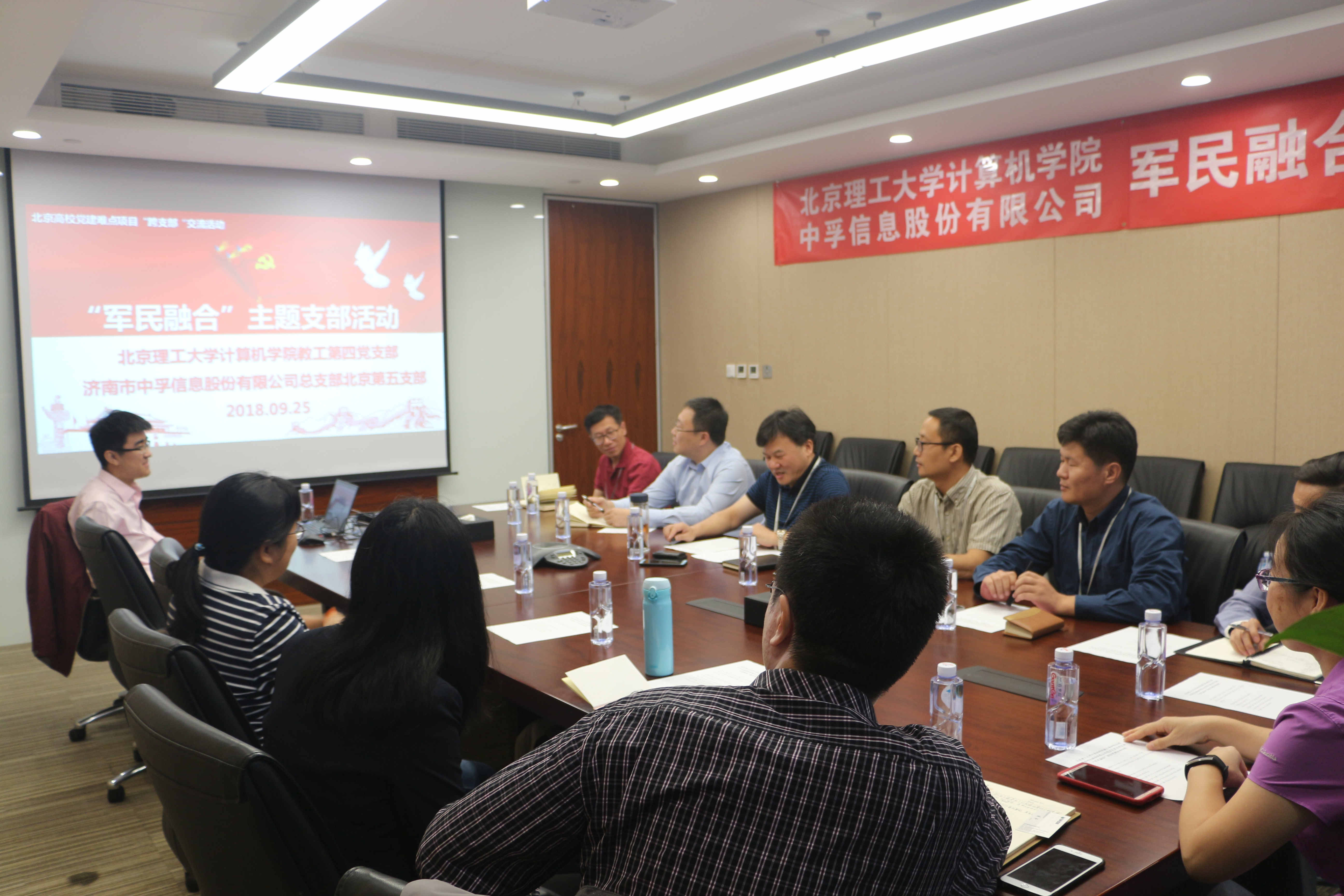 2018年9月25日上午,金年会第五党支部与北京理工大学计算机学院教工第四党支部,以“军民融合”为主题,进行首次联合党建交流活动。北京理工大学计算机学院教工第四党支部书记祝烈煌、金年会党总支书记张太祥以及双方部分党员同志参加了活动。